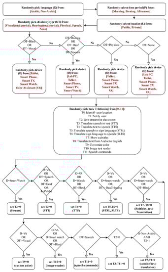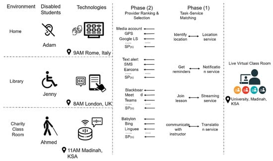 In the context of IoT and restful web services, the authors of [23] proposed a service composition strategy based on semantic ontology created by a domain expert. User-requested goals are fulfilled either in a semi-automated or fully automatic manner by invoking a series of predefined actions. In a similar study [24], the authors presented a health and emergency care platform for elderly and disabled people to monitor their health status autonomously with a relevant response. In this approach, data are collected from diverse sensors deployed in surroundings and analyzed, and a corresponding action is triggered based on the context determined through fuzzy rules. Researchers also developed a platform as a service [26] whereby people can develop applications in a smart city environment for disabled or older people. The platform has a provision to query and discover relevant services (as a service list) to be utilized in the application. The services are discoverable based on the service description, annotations, and analyzed data. The authors of [27] developed a system in an IoT and smart city context for improved utilization and management of parking spaces allocated for use by people with disabilities. In the education sector, a middleware system was proposed in [28] for the inclusion of disabled people to provide equal education opportunities. The proposed system is called ONTODAPS (ontology-driven disability-aware personalized e-learning system). Education information is collected from a typical education environment, e.g., a university or learning institute and represented in a form compatible with the user disability. ONTODAPS also caters to the needs of users with multiple disabilities through personalization. With the help of a personalization agent, the whole process is automated, adjusting to the needs of the learner. The context is determined based on the student profile information maintained in the database. Most of the above-mentioned techniques utilize workflow-based, rule-based, or context-based predefined service selection to achieve the desired objective in diverse domains.