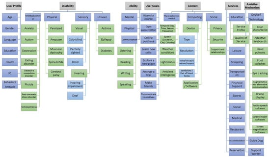 Context awareness can help identify and elaborate the needs and preferences of disabled persons. This, in turn, can derive the inclusion of the most relevant service selection. Our proposed ontology includes a wide range of aspects of the disabled person’s context, such as physical/environmental, computing, and social, as suggested in various studies [67,79,80,81,82].
