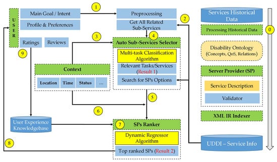 Service selection can be achieved by applying various methods [10,11,12]. The selection process is complex because it needs to satisfy several constraints and may change dynamically based on the task at hand. Three main categories of service selection stand out in the literature, namely decision making, fuzzy, and metaheuristic approaches [12]. For instance, multi-criteria decision-making (MCDM) methods [13] have been proposed and researched extensively to deal with the service selection dilemma [14,15]. Moreover, a review of previous research on service selection [16,17,18] reveals that intelligent approaches for choosing accessible services are limited, to say the least. In our methodology, we first determine the assistive tasks that support the activities of the disabled users through a multi-task classification approach and then propose the best service providers for each relevant task using a dynamic regressor model.