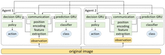 where T represents the time step of each episode, represents the hidden state of the prediction GRU at time T, represents the parameters of the classifier and represents the prediction category. The final image prediction is made jointly by all agents, which can be expressed as follows: