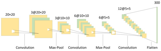 After the local observation is generated, the feature of the local observation is extracted by the convolutional neural network. Taking the local observation of pixels as an example, the structure of the convolutional neural network is shown in Figure 4. It includes three convolutional layers and two max-pooling layers and finally passes through the flatten layer. Using to represent the parameters in the convolutional neural network, the feature extraction process can be expressed as follows:
