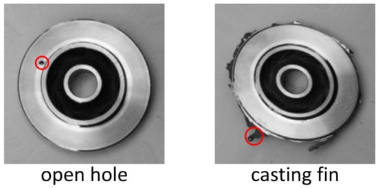 In this data set, the casting defects can be mainly divided into two categories: open holes and casting fins. The defects of open holes can be caused by trapped air when the metal is poured into the mold. The defects of the casting fins show up when some extra materials are attached to the edges of the casting. Examples of both type of the defects are shown in Figure 7. However, this paper only studies the surface defects of the castings, which can be detected by visual signals.
