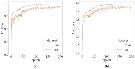 By modifying the number N of agents based on the default settings, the change in the -score is shown in Figure 11. It can be seen that when the number of agents is increased to 15, the curve of the -score changes significantly and can converge faster. As can be seen from Table 1, for each additional five agents, the average training time per epoch will increase by about 15%, and the average test time per epoch will increase by about 10%. When the number of agents is 20, the top-1 -score in the test dataset can reach 0.98677. Compared with the case of , the number of agents has become four times the original, but the average training time per epoch only increases by 47.7%, and the average test time per epoch increased by 33%.