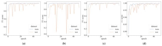 Modifying the window size w based on the default settings, the change in the -score is shown in Figure 13. As can be seen from Figure 13, when w = 10, the -score of the training dataset is lower, and the convergence speed is also accelerated as the window size increases. It can be seen from Table 1 that the change of window size has less impact on the training and test time, but when the window size becomes too small, the -score of the test dataset drops a lot.