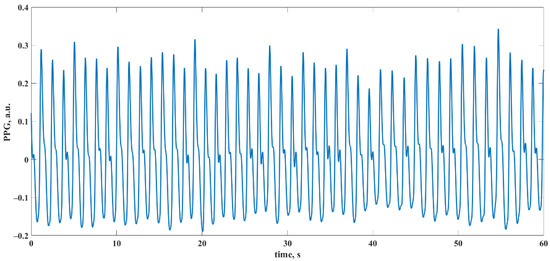 Participants were asked to evaluate their temperature and comfort perception based on category scales for comfort and temperature sensation proposed in [44]. Before the experiment, participants were asked to answer a questionnaire regarding personal history of CVDs, gender, age, presence of sickness at the time of data collection, and lifestyle habits such as smoking and sports activity. Only data from nonsmoking participants with no history of CVDs and in good health condition who reported comfortable environmental conditions were included in this study. As a result, a total of 30 datasets were used. An example of a 60 s segment from one of the PPG recordings is shown in Figure 2.