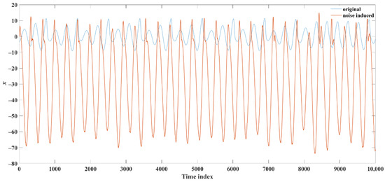 where a = 0.2, b = 0.2, and c = 5.7 [48]. The Rössler model was numerically solved using the fourth-order Runge–Kutta method with sampling rate of 1000 Hz. To imitate the measurement noise, additive dynamical noise was introduced. On each iteration i of the numerical solution method, noise was added to the solution xi using the following equation: , where is the noise scaling coefficient, which varies from 0 (i.e., no noise) to 0.5 in increments of 0.05; is the ith component of a fixed uniform random noise vector; and is the input of the next iteration. For computational efficiency, the resulting time series x was subsampled using a factor of five. Examples of the resulting time series obtained using the original ( = 0) and noisy ( = 0.25) x time series are shown in Figure 3, where the addition of dynamical noise affected the amplitude of the time series and created additional fluctuations compared to the original time series.