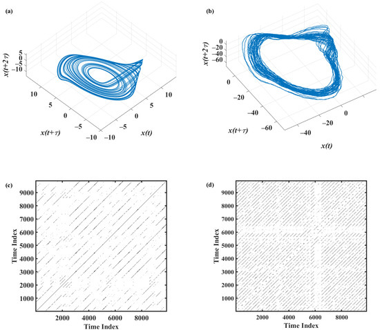 Reconstructed attractors from x time series of (a) original (θ = 0) and (b) noisy (θ = 0.25) Rössler systems and the resulting RPs (panels (c) and (d), respectively).