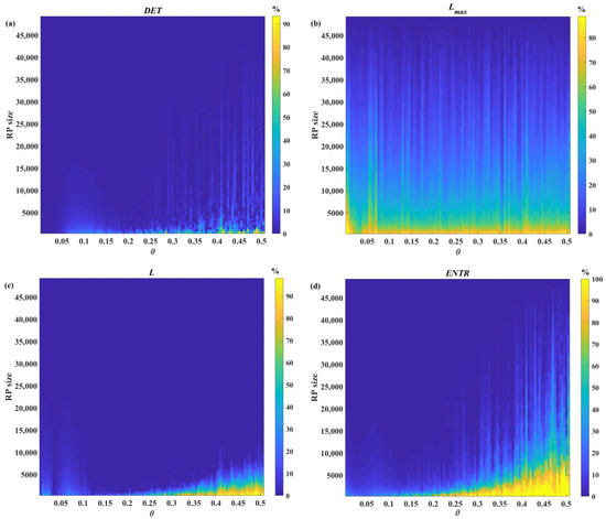 where i, j = 1, …, N and ε is the threshold that defines the area where neighboring points of the time-delay-reconstructed trajectory are searched. If the point Xi is located within the sphere centered in Xj with radius ε, then the (i, j)-pixel is included in the RP. In this study, ε was equal to 10% of the reconstructed attractor size [40] defined by the maximum distance between attractor points: .