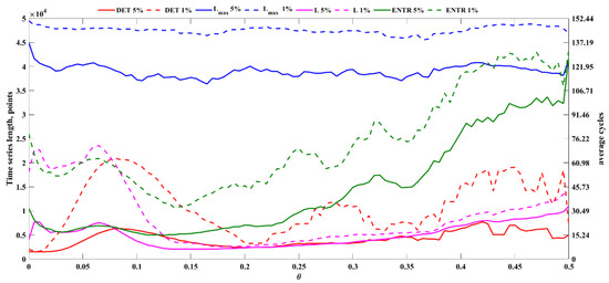 Figure 5 shows the relative errors of DET (a), Lmax (b), L (c), and ENTR (d) as a function of noise level (θ) and time series length, as averaged over 100 segments. Table 1 shows four calculated RQA measures reference values for three levels of noise. Table 2 shows the time series length corresponding to relative errors equal to 5% and 1% for three different noise levels. A relative error lower than or equal to 1% is considered acceptable. Therefore, the corresponding length can be used as a benchmark for the minimum length of the time series. Figure 6 shows detailed information of the length of the time series associated to relative error below 5% and 1% for the four RQA features here computed.