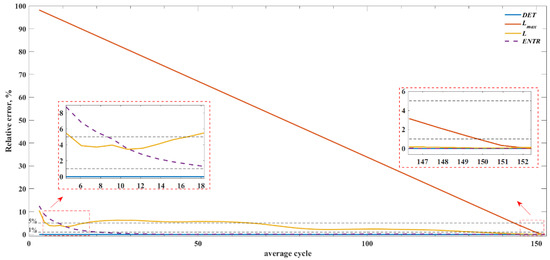 In this study, the lower limit of the length of the time series was determined by considering the average time required for the original time-delay-reconstructed trajectory to complete one turn on the time-delay-reconstructed attractor, hereinafter referred to as “average cycle”. Specifically, the lower limit of the length of the time series was set as the time required to complete 3–5 average cycles to ensure the presence of at least one separated cycle fragment of trajectory in the neighborhood depending on the density of the reconstructed attractor trajectories. The length of the time series (T) assumed to lead to accurate estimates of the RQA features defined in Section 3.3 was defined as over 100 average turns of the trajectory on the reconstructed attractor. A set of RPs were computed, and RQA was performed for varying lengths of the time series. For each RQA feature S, the relative error associated with the estimate of S using a time series of length l with respect to the accurate measure obtained using a time series of length T was calculated as follows [54]: