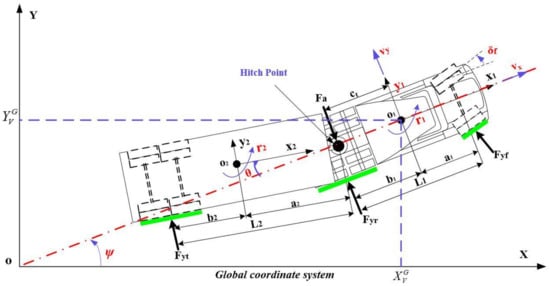 With reference to the modeling methods in previous studies [23,28] and considering the necessary dynamic response characteristics, the multi-axle system is simplified to a single-axle system. The following assumptions are made: (1) forward speed is a constant value and is guaranteed by a PID algorithm embedded in the software; (2) dynamics of the tire are ignored, and the linear tire model is adopted; (3) the articulation angle and the tire slip angle are small, and sin δf ≈ δf, sin θ ≈ θ, cos δf ≈ 1, cos θ ≈ 1; and (4) ignore the influence of steering system, suspension system, etc., vehicle parameters remain unchanged. Although linear tires can reduce the accuracy of the prediction model at high speeds, they can improve the calculation speed and reduce the complexity. In the following chapters, the FC method can effectively make up for the shortage of decreased prediction accuracy. The symbols and physical meanings of vehicle dynamics parameters are shown in Table 1.