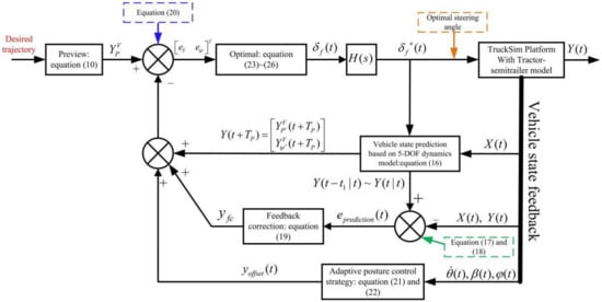 To date, a variety of PFAs has been developed. The Optimal Preview Control Path Driver model (OPCDM) proposed by MacAdam is the most representative [10,11]. The model is still used in commercial software such as CarSim. With the development and maturity of intelligent control theory, Neural Network-based Path-Following Algorithm [12,13,14], Fuzzy Control-based Path-Following Algorithm [15,16], Model Prediction Control-based Path-Following Algorithm [17,18], Machine Learning-based Path-Following Algorithm [19,20] and so on, have been proposed. These models are characterized by more predictive information, stronger robustness, more complex structure design and a higher degree of personification. However, most of these PFAs were applied to single-unit vehicles (SUVs).
