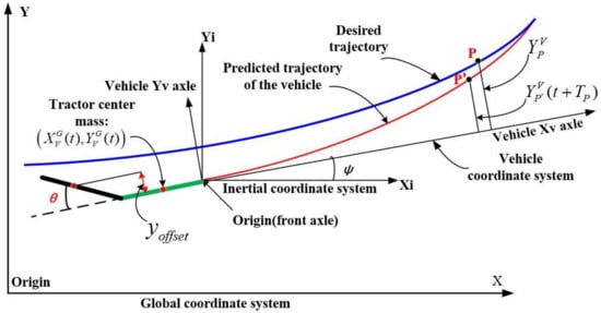Predicting the vehicle state for a period of time in the future is the basis for steering control, and the preview principle of AAAP-PFA is shown in Figure 4. The preview starting point is fixed at the center of the front axle of the tractor. Point P is the preview point. TP is the time required for the vehicle to travel to point P’ from the preview starting point. In engineering practice, the real-time longitude and latitude of the vehicle in the geodetic coordinate system and the preview point in the planned path can be calculated by positioning and navigation units [29,30]. The real-time motion state of the vehicle can be estimated more accurately by using Kalman filtering and other fitting algorithms [31]. The driver estimates the vehicle state and its relative position to the target trajectory by feeling [32,33].