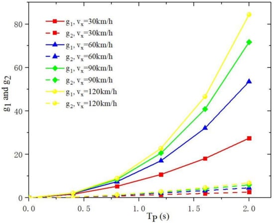 In Equation (26), the numerator of the second term on the right side of the function represents the prediction result, and the denominator represents the forced response coefficient of the prediction link. The FC link can ensure the accuracy and convergence of the prediction results. Therefore, the stability of the PFA is completely determined by the matrix G. If the state-space system of the linear vehicle model is stable, then TP will be the only variable that affects the finiteness and convergence of matrix G. Set g1 = G(1, 1), and g2 = G(1, 2). The denominator can be expressed as: