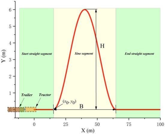 (3) Test 3: To simulate an environment with large sideslip, large roll and frequent swing, a sine trajectory is designed, as shown in Figure 7. The maximum lateral offset is H = 6 m, and the width is B = 50 m. The curve is constructed as follows: