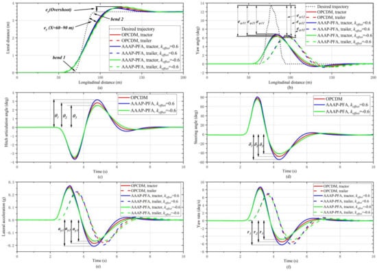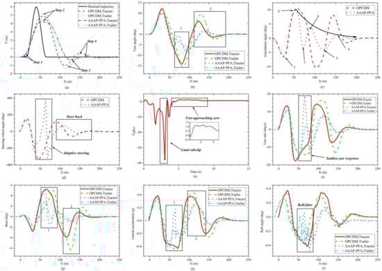 (1) Comparison of the first difference. From the lateral stability, the tractor-trailer with OPCDM shows a high sideslip at the point of maximum curvature, and AAAP-PFA, based on an adaptive posture control strategy, effectively limits the sideslip, as shown in Figure 11g. The reason is that the adaptive posture control strategy produces a large and negative offset, as shown in Figure 11e. This offset makes the steering wheel angle rapidly to the opposite direction and adaptively adjusts the posture of the vehicle units, as shown in Figure 11c,d. From Figure 11e, the process of posture adjustment is divided into two stages, namely: limit sideslip and fast approaching zero. The main reason why the novel PFA can prevent sideslip is that it can track the maximum curvature point and modify the posture and steering angle in real-time based on the vehicle states. In addition, the action of steering return causes a sudden yaw response and roll-jitter, as shown in Figure 11f,i. This phenomenon may bring unexpected consequences to the path-following process. Therefore, some measures of smoothing treatment need to be investigated.