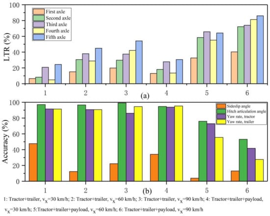 Figure 9 shows the accuracy of steady-state value prediction and load transfer in the unit angle step experiment under different speeds and loading conditions. Without loading, the prediction accuracy of the self-built model is higher than 85%, except for the sideslip angle. When loaded, with the increase in speed, the prediction accuracy gradually decreases. Thus, load and speed are the key factors for inaccurate prediction. In addition, the increase in speed is the main inducement of the load transfer rate (LTR). Due to roll, the vertical load of the outer tire increases so that the nonlinearity of the tire increases. The self-built vehicle model will have a large deviation in predicting vehicle states. Therefore, the main factor that determines the model prediction results and the robustness of steering control is speed.