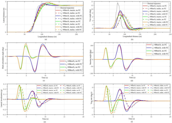 Figure 10 shows the simulation results of the AAAP-PFA with and without FC. It can be found that the trajectories of the two vehicle units with FC are closer to the desired trajectory under the two speeds, and the yaw angle error is smaller. Although there is a large overshoot at the end of the straight segment, the lateral displacement deviation and yaw angle approach zero significantly faster. In addition, the peak value of the steering angle, lateral acceleration and yaw rate are also increased. It can be inferred that the FC improves the robustness of the steering control.