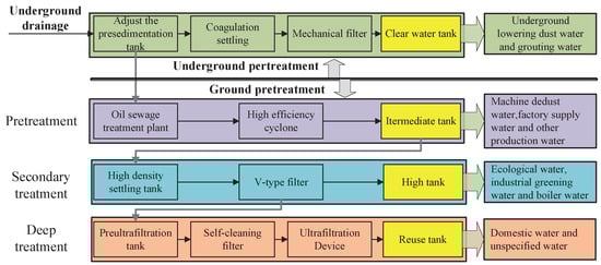Taking a coal mine in the Inner Mongolia Autonomous Region of China as an example, its mine water treatment process is shown in Figure 1. The mine water treatment process consists of three levels of treatment, namely pretreatment, secondary treatment, and deep treatment. The quality of mine water is continuously improved with the increase of treatment levels. After the mine water flows into the pre-sedimentation tank, part of it is pretreated by the coagulation sedimentation device and mechanical filter and then flows into the clear water tank. The reused water in the clear water tank can meet the requirements of underground water with lower dustand grouting water, so as to realize on-site reuse. The mine water after ground pretreatment, secondary treatment, and advanced treatment is stored in the intermediate tank, high tank, and reuse tank, respectively [22]. Among them, the intermediate tank can be used for machine dust water, factory water, and other production water supply, the high tank is responsible for providing ecological water, industrial greening water, and boiler water, and the reuse tank provides high-quality mine water, which can be used for ecological, agricultural, living, and other purposes with high water quality requirements [23]. Based on a comprehensive analysis, this mine water reuse treatment process can realize the classification treatment and quality utilization of mine water.