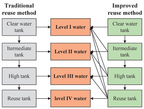 According to the water quality characteristics of the four reuse water points in the mine water reuse treatment process, the mine water points are correspondingly divided into four levels. In order to solve the problems of the slow recycling rate and low production efficiency caused by traditional recycling methods, this paper proposes a multi-level scheduling method for mine water recycling, as shown in Figure 2. The tank with high treatment levels can supply water to their corresponding water points of the same level or lower levels. Therefore, for low-level water points, there are multiple tanks supplying water to them at the same time. The novelty of this method is that it breaks the barriers between different levels of treatment links and water points in the traditional mine water reuse method and interconnects them, thereby enhancing the integrity of the mine water reuse system and greatly improving the efficiency of mine water reuse. Since there is a linear treatment relationship among the four water tanks, which satisfies the water balance constraints, the water volume change of a single water point will inevitably affect the water distribution relationship of the entire treatment system. This feature provides the feasibility of the physical logic of mine water scheduling optimization.