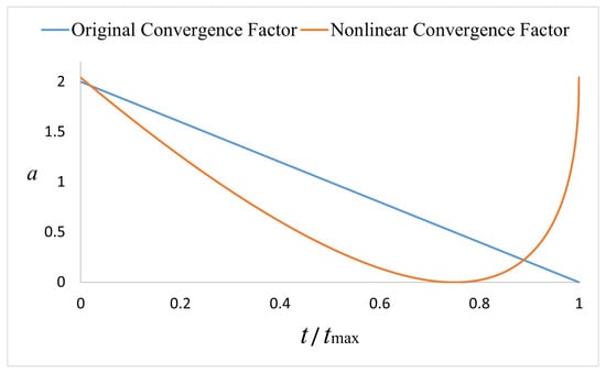 (3) Nonlinear convergence factor: According to the optimization principle of the basic whale optimization algorithm, the search prey of the whale group represents the global search. Usually, the global search operation is only implemented in the early stage of the iterative calculation, which is determined by a linearly decreasing convergence factor [31]. When the convergence factor , global search or local search will be further selected according to the size of . When , only local search can be performed. In the original whale algorithm, a is completely greater than 1 in the early stage and completely less than 1 in the later stage, which results in the separation of the global and local search in the early stage and the later stage. Once the global optimal value is not found in the early stage, it is easy to fall into the local optimum in the later stage. In order to balance the global and local search capabilities in the whole iterative process, inspired by [32], a nonlinear convergence factor is introduced in this paper, and it is shown in Figure 3.