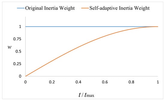 (4) Adaptive inertia weigh: The idea of inertia weight comes from the particle swarm algorithm, which represents the ability of the next generation of individuals to maintain the current state of individual motion and is an important parameter to adjust the algorithm’s search and optimization capabilities [33]. Inspired by this, the adaptive inertia weight is introduced in the improvement of the whale optimization algorithm in this paper, and it is shown in Figure 4.