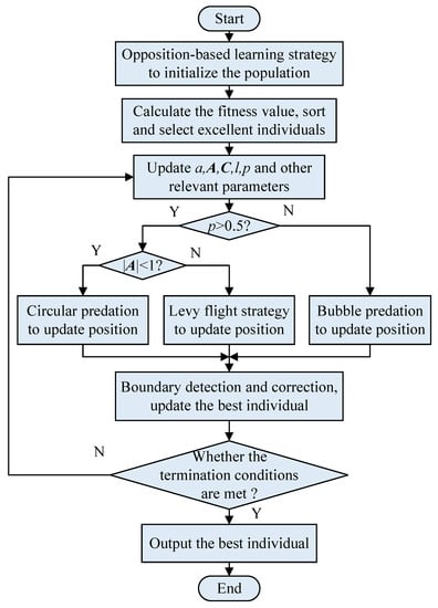 According to the calculation process of the basic whale optimization algorithm, the flowchart of the improved whale optimization algorithm is shown in Figure 5.