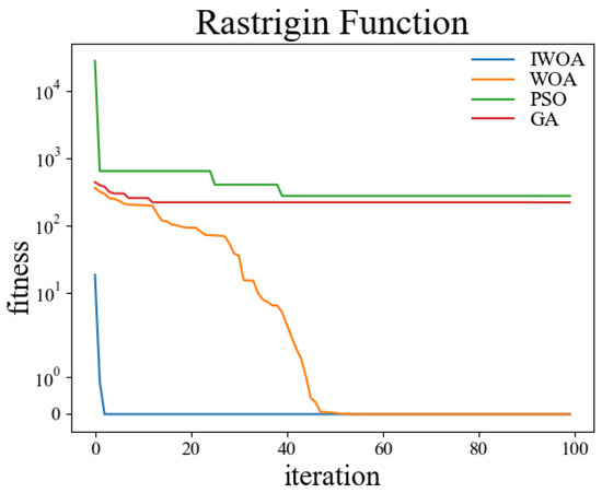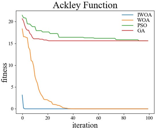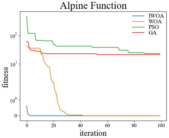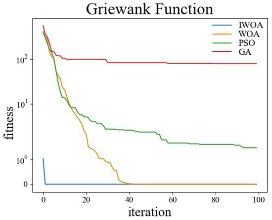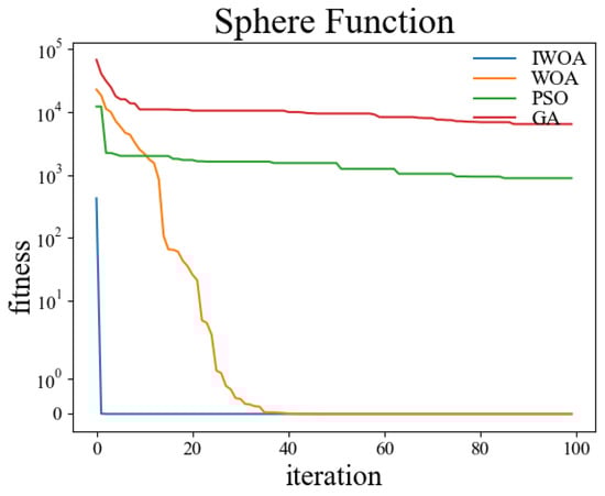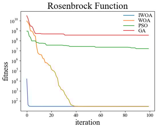 The test was carried out in a 30-dimensional search space. The population number was set to 50, and the maximum number of iterations was set to 100. Thirty independent experiments were carried out on the genetic algorithm, particle swarm optimization, whale optimization algorithm, and improved whale optimization algorithm, respectively. The crossover rate and variation rate of the GA were set to 0.8 and 0.1. The maximum particle velocity of PSO was set to 60. The spiral coefficient b of WOA and IWOA was set to 2. Table 2 shows the test results of the above four algorithms under the kinds of test functions, and the comparisons were made in terms of optimal solutions and standard deviations, respectively. The comparison figures of the change of the fitness values during the convergence of the four algorithms under each test function are shown in Figure 6, Figure 7, Figure 8, Figure 9, Figure 10 and Figure 11.