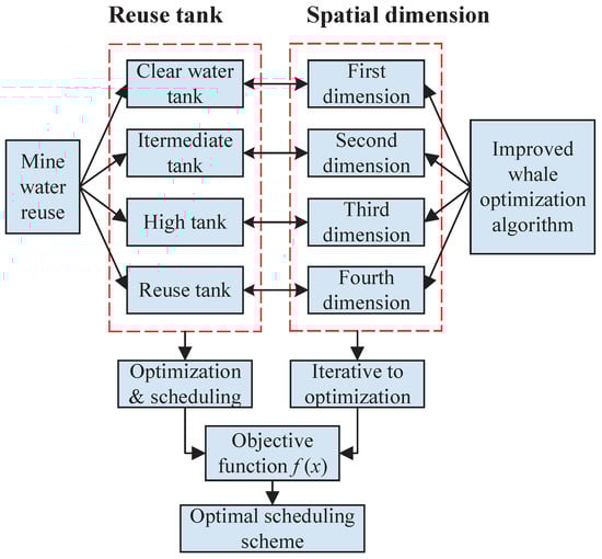 According to the spatial multi-dimensional characteristics of the improved whale optimization algorithm, this paper fully combines it with the multi-optimization objectives of mine water scheduling optimization. In this way, the transformation from complex problems to mathematical problems can be realized, that is the scheduling problem of mine water reuse tanks at all levels to water points at all levels is mapped to the optimization process of the whale optimization algorithm in the multi-dimensional solution space. The specific design principle is to combine each recycled water tank in the mine water reuse treatment process with the spatial dimension of the whale optimization algorithm. The physical meaning represented by each dimension value is the amount of water supplied by each tank to its water point. Iterative optimization is carried out under the constraints, and the optimal solution of the objective function based on mine water recycling efficiency and recycling cost is finally obtained. The combined schematic diagram is shown in Figure 12.