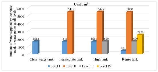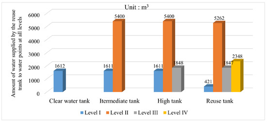 Compared with the traditional reuse method of mine water, which follows the principle of proximity, in the improved multi-level scheduling method, the reuse water of each water point is no longer taken from the reuse tank of its corresponding level alone, but is supplied by multiple reuse tanks at the same time, which realizes the redistribution of water resources between each tank and each water point in the mine water reuse system. Taking a single water point as a reference, it can be found that the water supply from each tank is not equal to each other, which is caused by the combined consideration of mine water reuse cost and reuse time constraints.