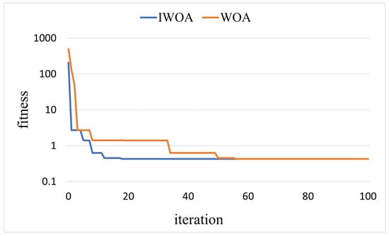 Comparison between the fitness values obtained by the WOA and IWOA during the iterative process.