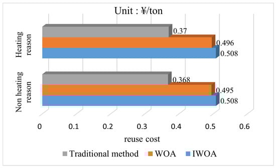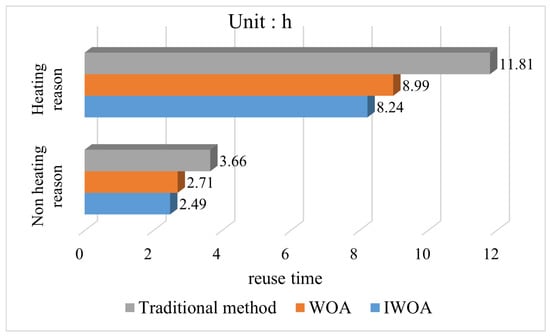 Based on the obtained optimal mine water scheduling scheme, the mine water reuse time and ton water treatment cost were obtained for the heating and nonheating seasons, where the mine water reuse time is the sum of the water supply time from the reuse tank to the water points at each level in turn. The reuse time and cost of the conventional method and the multi-level scheduling method using the WOA and IWOA seeking optimization were calculated, respectively. The results obtained are shown in Figure 16 and Figure 17 as follows.