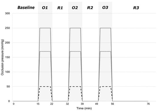Using an experimental design, participants were randomly assigned to one of three groups with different occlusion pressures: 50 mmHg (G1), SBP + 50 mmHg (G2) and 250 mmHg (G3) [28,29]. The protocol is described in Figure 1 and consists of a baseline period followed by 3 × 7 min occlusion phases interspersed with three reperfusion phases where the cuff was deflated.