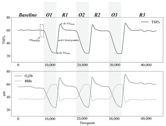 NIRS data were acquired at 10 Hz, and the signal was smoothed using a 10th-order low-pass zero-phase Butterworth filter (cut-off frequency 0.8 Hz) using Pandas software library functions for Python (Python 3.8.8, Python Software Foundation, https://www.python.org, accessed on 19 October 2021) [32]. To avoid any disturbance linked to the beginning of the protocol, TSIbaseline, HHBbaseline and O2HBbaseline were calculated as the average of the last minute before the first occlusion.