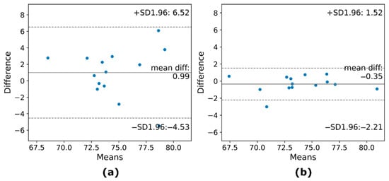 Examples of Bland–Altman plots of the reliability across trials for TSImax of participants belonging to the group 2 (G2): (a) between sessions (bias = 0.99, 95% CI = −4.53 to 6.52) (b) and within sessions (bias = −0.35, 95% CI = −2.21 to 1.52). The within-session trial comparison (b) shows a lower dispersion around the mean compared to between-session trial comparison (a).