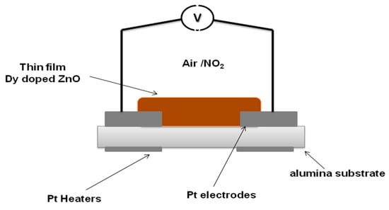 With the aim of studying and comparing the gas sensing properties of pure and Dysprosium doped ZnO thin films, the sensitive films were deposited onto commercial alumina substrates (0.4 × 2.25 cm in size, see Figure 1). The sensing devices comprise 0.25 × 0.73 cm screen-printed interdigitated platinum electrodes and a heating resistor (6 Ω) on the backside (Figure S1). The resulting gas sensors were placed in an airtight Teflon chamber and exposed to different concentrations of the target gases. The electrical resistance was measured using an Agilent-34972A multimeter and the operating temperature was modulated by an external power supply. Several NO2 gas concentrations at the ppb range were measured in dry and humid (50% of relative humidity) environments.