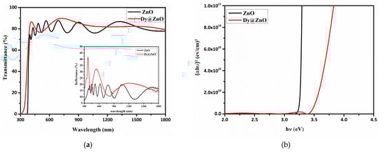 Figure 4a shows the transmittance and reflectance curves for the pure and Dy-doped ZnO thin films. The interference fringes confirm the homogeneity and the excellent surface quality of the deposited films. The interference fringes reveal the aspect of the surface, which is a smooth reflection that enables the achievement of no scattering losses. It is worth mentioning that the samples have a high optical transmittance, achieving 80%, and a fundamental absorption edge at 380 nm. The reflectance spectra show low values of reflectance for both films.