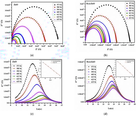 The complex impedance curves of Z” as a function of Z’ regarding pure and doped ZnO thin films in the temperature range (573–633 K) are displayed in Figure 5a,b. The data analysis presents only one semi-circle, which indicates that the electrical process in the samples is mainly due to the grain contribution. Each semi-circle can be modeled by an electrical equivalent circuit, which consists of a resistance (R) and a capacitance (C) connected in parallel. It is worth noting that the radius of the semicircular arcs decreases as the temperature increases for the two samples, revealing that the electrical conductivity is thermally activated, as well as the relaxation time distribution [37].