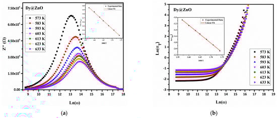 Moreover, the resistivity levels (i.e., baseline resistance) of the Dy-doped ZnO are lower than those obtained for the pure ZnO. This is probably because of the partial substitution of Zn2+ in the pure sample by Dy3+ in the doped thin film and the thinner film. As a result, the additional free electrons are released into the conduction band, increasing the electrical conductivity [13]. In order to study the relaxation time as a function of temperature, the variation in the imaginary part of impedance Z” versus angular frequency at different temperatures of ZnO undoped and doped thin films are presented in Figure 5c,d. The analysis shows that all the spectra have a single peak of relaxation for each temperature whose maximum (Z” max) shifts to higher frequencies with increasing temperatures [38].