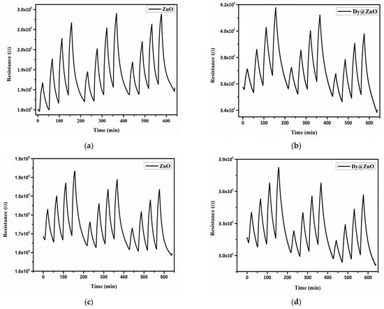 Sensor resistance when detecting NO2 at 150 °C with pure (a) and Dy-doped ZnO (b) in dry conditions. The experiments were repeated under a humid atmosphere for pure (c) and Dy-doped ZnO (d) thin films.
