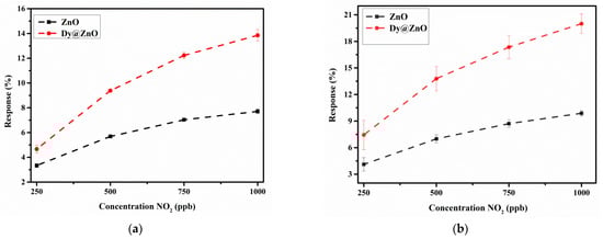 Despite the noteworthy detection of NO2 using the Dy@ZnO nanohybrid under dry conditions, the assessment of the humidity effect is essential for practical applications in ambient monitoring [49]. Thereby, since the presence of water molecules is a well-known interferent, the previous experiments were reproduced under humid conditions (relative humidity was set to 50% @23 °C). Figure 7c,d show sensor resistance under humid conditions of pure and Dy-doped ZnO, respectively. Stable and repeatable responses were obtained in the presence of ambient moisture, demonstrating the robustness of the sensitive films for detecting NO2 in humid conditions. Figure 8b depicts the calibration curves obtained for both sensitive films. It is worth mentioning that higher resistance changes for pure and Dy-doped ZnO were obtained when detecting NO2 in a humid environment in comparison to a dry atmosphere. This is probably because water molecules tend to act as an electron-withdrawing specie as NO2. In that way, the simultaneous presence of both compounds probably enhances the overall resistance changes. However, considering the sensitivity is given by the slope of the calibration curves, both thin films showed slightly higher sensitivity in a humid environment in comparison to dry conditions (Table S1). Interestingly, in the presence of ambient moisture, the pure and Dy-doped ZnO showed a 17% and 28% increase in response when detecting NO2 compared to a dry environment, respectively. The presence of Dy increases the reactivity of the thin film, but without compromising the stability and repeatability of the gas detection.