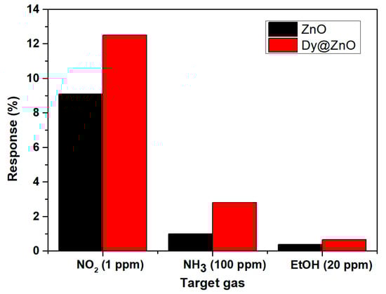 Cross-sensitivity is a common problem in chemoresistors that frequently prevents their implementation in commercial devices. From this perspective, Figure 9 depicts an additional test summarizing a response comparison when detecting 1 ppm NO2, 100 ppm of NH3, and 20 ppm of ethanol at 150 °C. An example of the sensing responses obtained for an electron-donor gas compound as NH3 is represented in Figure S5. It is worth noting that significantly higher responses for NO2 were obtained in comparison to other gases such as NH3 and ethanol, even though the lower concentration range tested for this gas. The reason is probably explained by previous experimental findings through density functional theory (DFT) calculations on ZnO nanostructures. The adsorption energy for NO2 is significantly lower than that of other gases tested such as NH3. In contrast, the charge transfer derived from this interaction is higher in the case of NO2 [50,51]. In other words, when Dy-doped ZnO is detecting NO2 levels, more dynamic adsorption–desorption processes and higher resistance changes may occur owing to the small binding energy and the large charge transfers associated to this interaction.