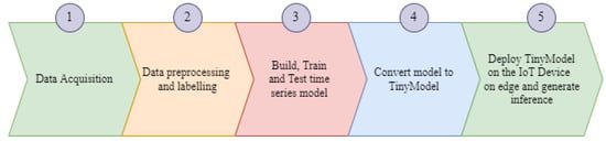 Following the defined steps to develop and deploy a predictive TinyModel, as shown in Figure 1, the main Predictive Maintenance (PdM) engine is the data and the way they are preprocessed. The type and quality of data determine the prediction accuracy that reflects the correctness of decisions on maintenance actions to be taken. For better precision in prediction, two types of data are needed: historical and real-time data. Historical data help to understand the operation of the equipment and to select the critical physical condition parameters to be monitored in a real-time manner. They are recorded by the experts in maintenance who also help to determine the necessary parameters to monitor. The real-time data from the specified equipment shall provide clear insights of its real health status. This also requires vigorously observing any change from the real-time data against the behaviors of the equipment operating status.