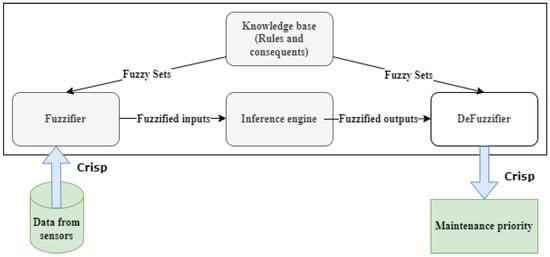 For complex industrial equipment with many components, including uncertain and imprecise behavior, there is a risk that unplanned downtime may occur for the whole system. To address this problem, fuzzy logic is a powerful tool for modeling and controlling this type of equipment [27]. Referring to the literature [28,29,30,31,32,33], fuzzy logic has been used in maintenance as a decision-making, scheduling, and hazard-level reckoning tool.