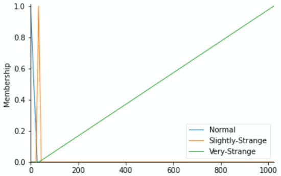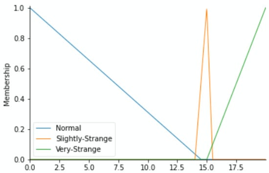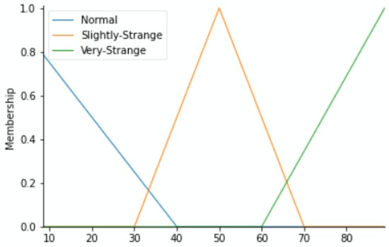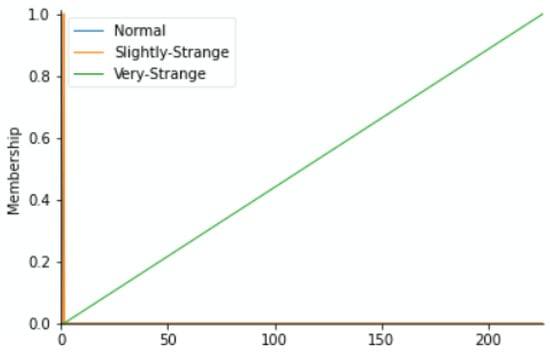 To label our data, we reflected on the fact that each component may push the equipment to downtime. Based on the historical methods used to detect errors during regular preventive maintenance and expert inspections as well as their results, we have classified the health status into the Fuzzy Expert System’s linguistic variables of each component versus the value range of its working condition parameters as Normal, Slightly Strange, and Very Strange. The output variable (maintenance action priority) zones shall depend on the fuzzy membership functions of status from the four variables. By means of the triangular membership function, Figure 4, Figure 5, Figure 6 and Figure 7 show the linguistic variable as the health status ranges (on the X-axes) of different parameters—Figure 8 summarizes the maintenance priority output. The X-axes and Y-axes present the ranges of maintenance priority and the degree of priority, respectively.