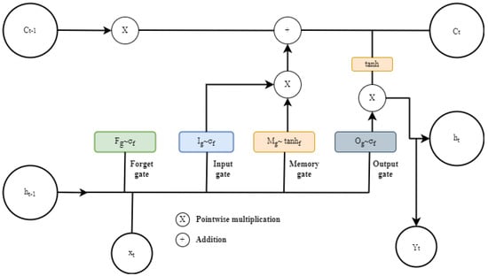 Bearing to the ordinary short-term memory of the RNN, LSTM adds long-term storage capability and gates that allow the algorithm to reflect on the long-term dependencies from the data of the past iterations and also increase the learning process. This makes LSTM more suitable to handle sequential problems, especially with time series data. The information to be kept or forgotten from the LSTM memory is determined by its gates. The LSTM cell structure is shown in Figure 9, which presents four collaborating gates, namely input (I), forget (F), memory cell (M), and output (O) gates, which replace the hidden neurons of the ordinary RNN.