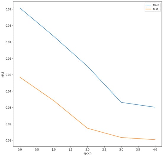 Figure 10 presents the model loss trend. To determine the best model performance values for minimum loss and overfitting, at each hyperparameter value, the model was tested on both datasets. It is seen that the losses for the test dataset are lower than that of train dataset and overfitting was not present. In addition, both model training and testing losses are lower as the epochs increase and keep steady at closer points.