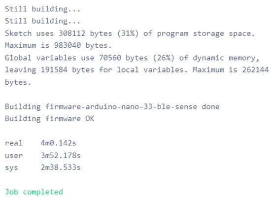 Finally, the TinyModels for both LSTM and the model from Edge Impulse were built, and the source files were downloaded to be installed and deployed on the embedded device. Figure 16 shows the TinyModel firmware for Arduino Nano BLE Sense built from Edge Impulse.