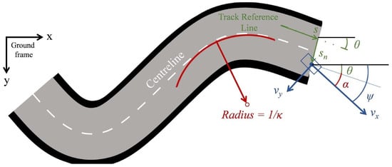 The curvilinear coordinates approach has been proposed by Lot et al. [23], and is the most effective way to describe the road centreline using only the line curvature as a function of arc length s (Figure 1). The main advantage of the curvilinear coordinates approach is their use in tracking the orientation of the vehicle based on the calculus of the vehicle forward () and lateral velocity () according to Equations (3)–(5):