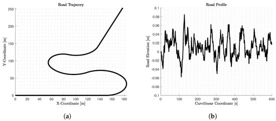 In this work, initially, we design a road path (Figure 2a) to seek the optimum velocity profile and then, a random road profile of Class B [24] (Figure 2b) is used to study in depth the vehicle dynamic behaviour using IPG/CarMaker 8.0.